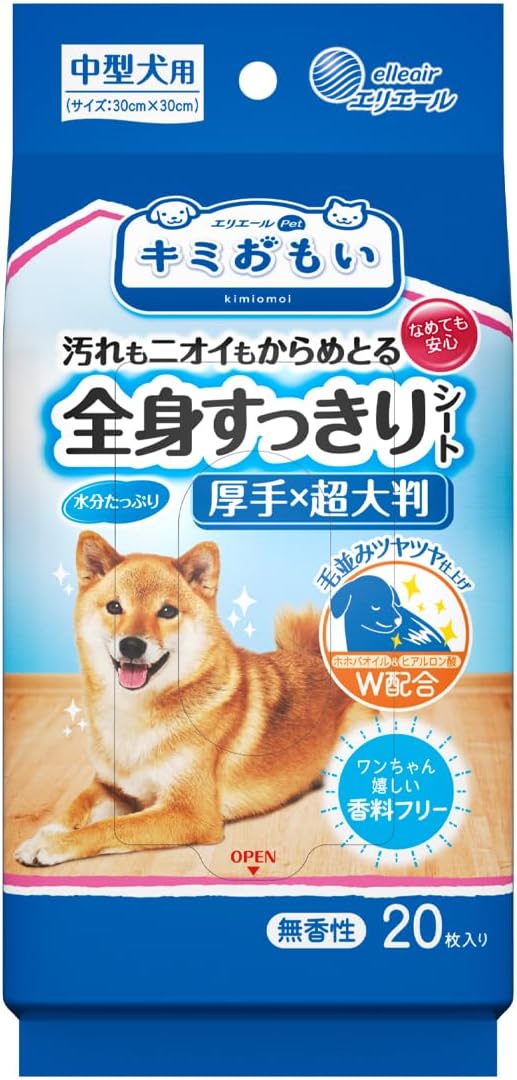 犬用の大判身体拭きシートは、サッと拭けて肌にもやさしいのでおすすめです。